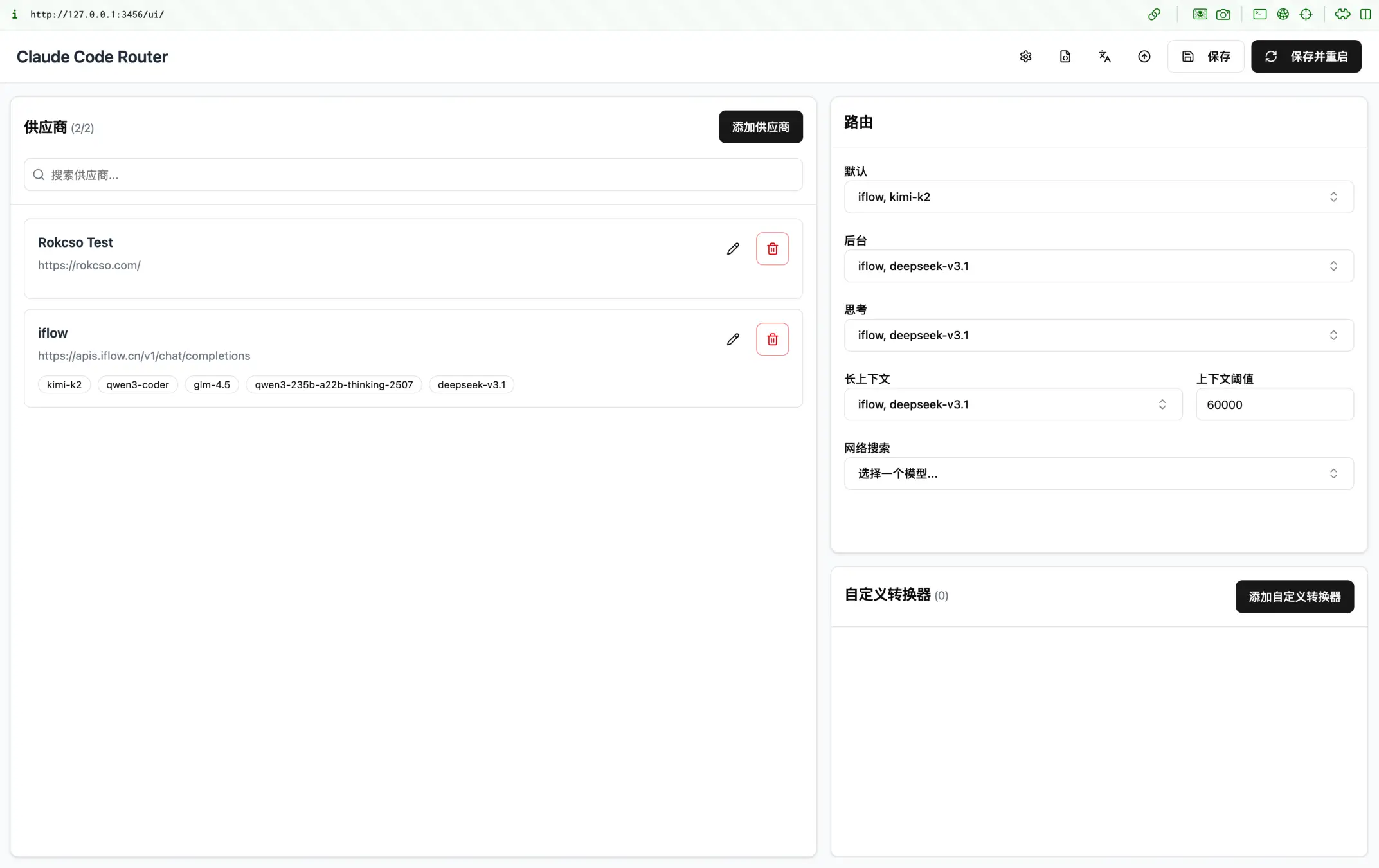 然后再在图形化界面中的「路由」设置部分选择各种任务要使用的模型,完成后点击「保存并重启」即可。注意:每次修改配置之后都需要重启服务,如果使用命令则是 ccr restart。
